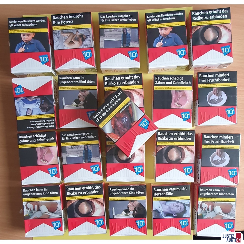 Sie bieten auf 8 Schachteln Marlboro rot, Inhalt pro Schachtel: 22 Stück, Originalpreis pro Schachtel 8,00 Euro sowie auf 21 Schachteln Marlboro rot, Inhalt pro Schachtel 29 Stück, Originalpreis pro Schachtel 10,00 Euro, Gesamtpreis insgesamt: 274,00 Euro. Es wurde ein Rabatt von 25 % gewährt. Der Verkauf und die Aushändigung der Ware darf nur an Personen über 18 Jahre erfolgen.
