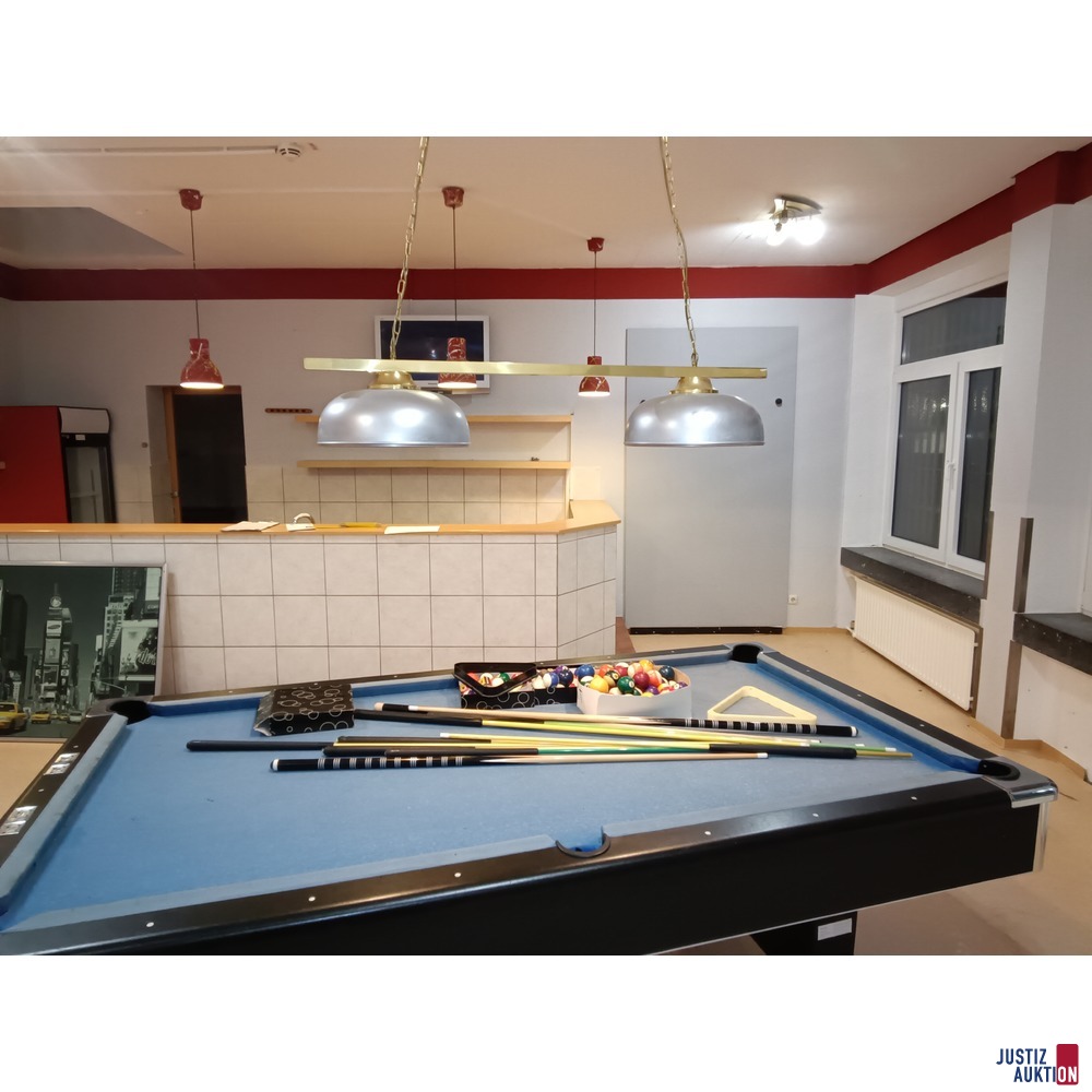 Der Tisch zeigt altersbedingte Gebrauchsspuren, ist aber spielbereit. Der Tisch kann während des Bieterverfahrens nach vorheriger Terminabsprache vor Ort besichtigt werden. Der Termin ist schriftlich zu vereinbaren. Über die genauen Zutrittsmodalitäten wird der Interessent/die Interessentin im Einzelfall vorab informiert. Das auf den Fotos abgebildete Billardzubehör und die über dem Tisch befindliche Pedelleuchte ist inklusive.