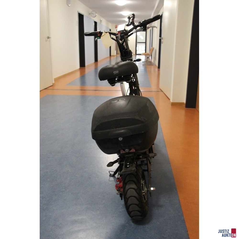 Zum Verkauf steht ein gebrauchter E-Scooter der Marke eFlux. Der Scooter ist voll funktionstüchtig. Eine Handy-Halterung ist am Lenker montiert. Darüber hinaus ist ein Topcase für einen Helm angebracht (ohne Helm). Schlüssel für das Case ist am Schlüsselbund des Zündschlüssels angebracht. Es befindet sich eine orangene Warnweste und ein Nummernschild-Halter in dem Case. Ein Ladestecker ist nicht beim Fahrzeug, es ist jedoch voll aufgeladen.