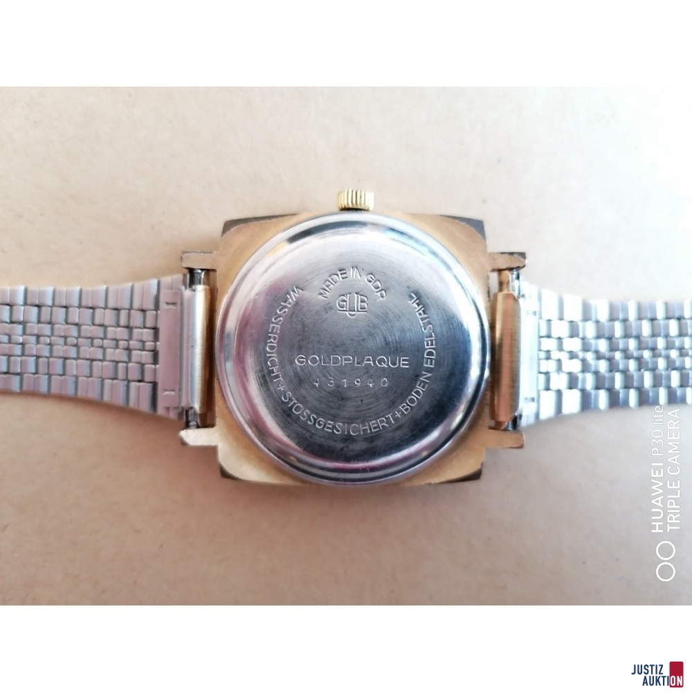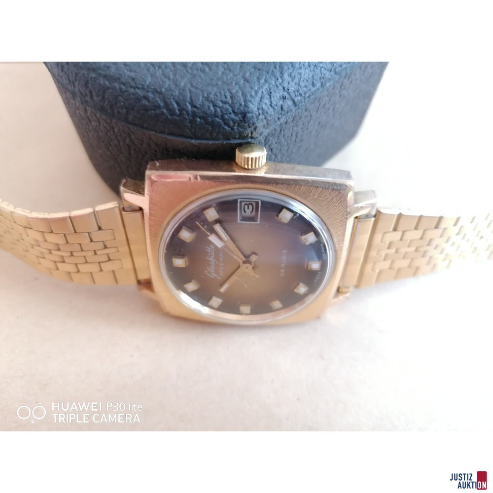 Zur Versteigerung kommt eine GUB Glashütte Spezimatic in goldfarbenem Gehäuse mit dazugehörigem goldfarbenem 7-reihigem Gliederband. Das rechteckige/kissenförmige Gehäuse mit konvexen Seiten misst ca. 32/33 mm. Das Armband passt bis zu einem Handgelenksumfang von ca. 20 cm. Die Verstellung erfolgt mittels Klemme mit Steg.