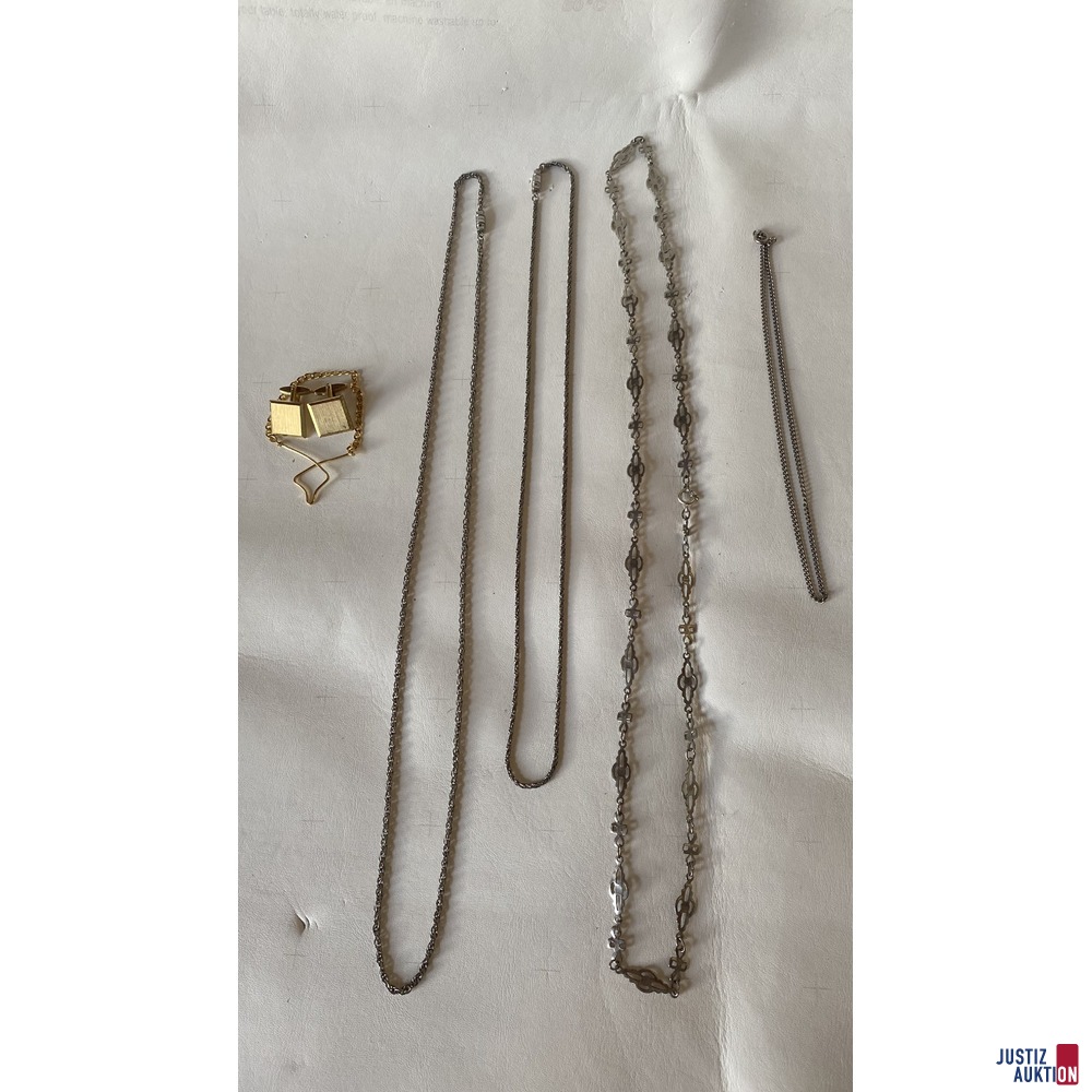 Versteigert wird gebrauchter gold- und silberfarbener Modeschmuck. Laut Juwelier handelt es sich nicht um echtes Silber oder echtes Gold. Im einzelnen handelt es sich um 4 silberfarbene Ketten von ca 36, 80, 76 und 60 cm Länge, zwei goldfarbenen Manschettenknöpfe und einem goldfarbenen Krawattenhalter.