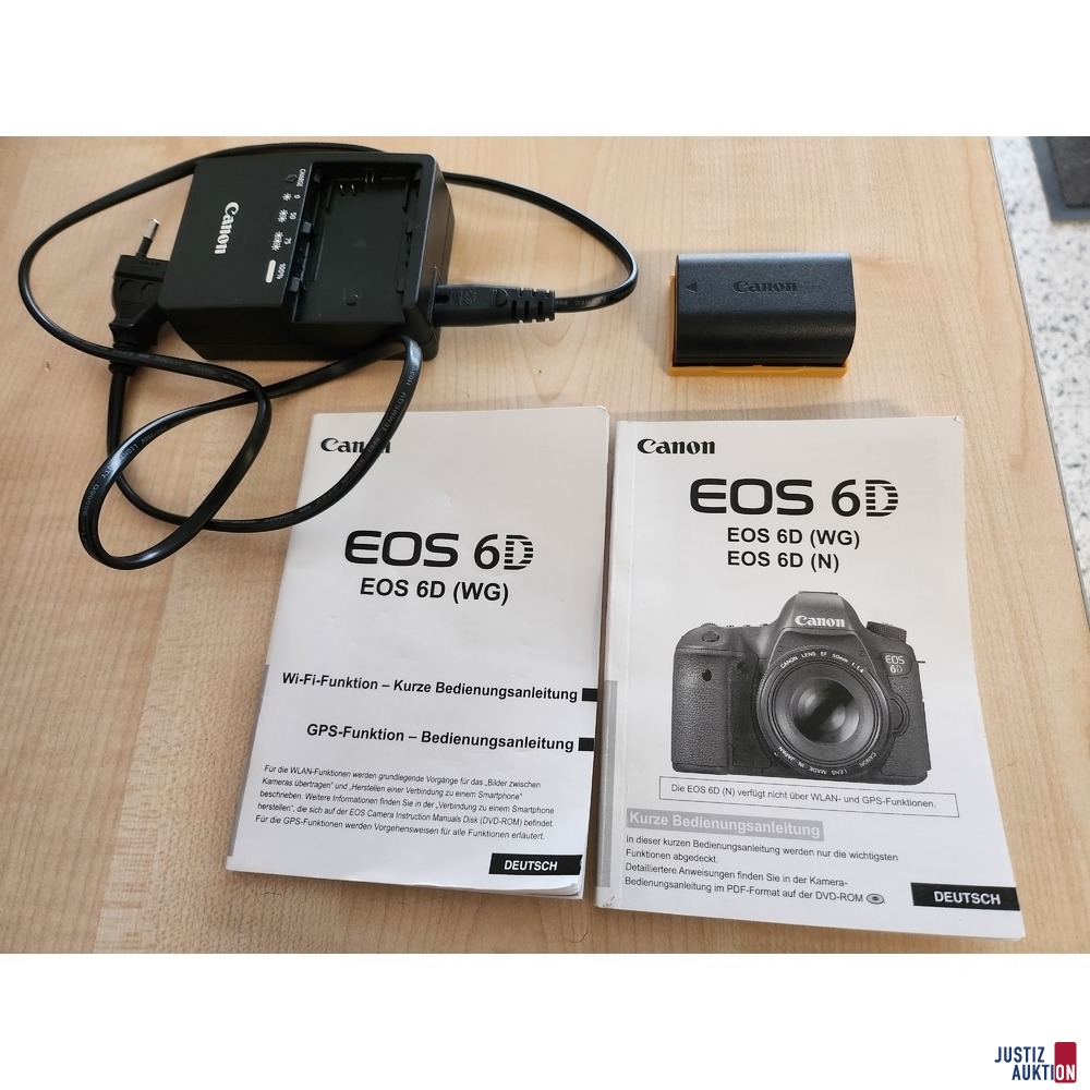 Kamera der Marke Canon EOS 6 D incl. Objektiv Canon 24-105 mm, Ladegerät, Akku und Bedienungsanleitungen.