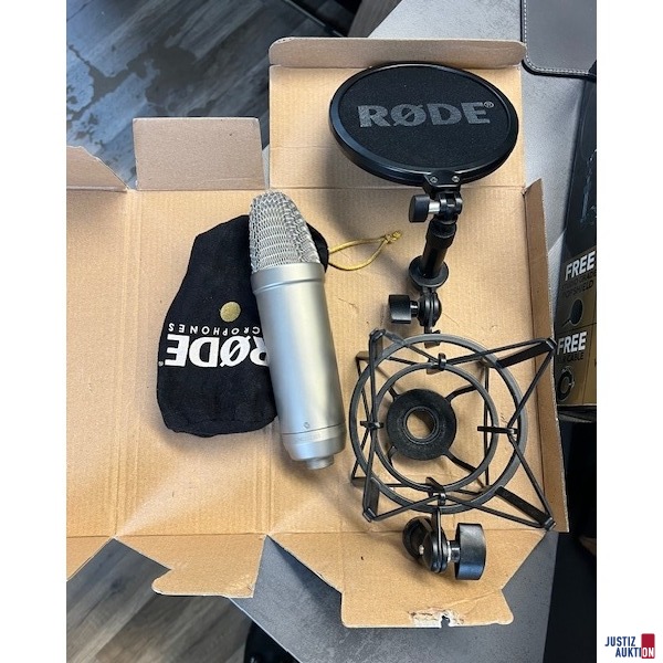 Versteigert wird ein Rode NT1-A Microphone mit SM6 Shockmount und Popshield inkl. Zubehör (Stromkabel, Staubhülle, Bedienungsanleitung, CD, Original-Karton) im Set mit einem Focusrite Scarlett 2i2 USB Recording Interface, ebenfalls mit Karton und Kabel.