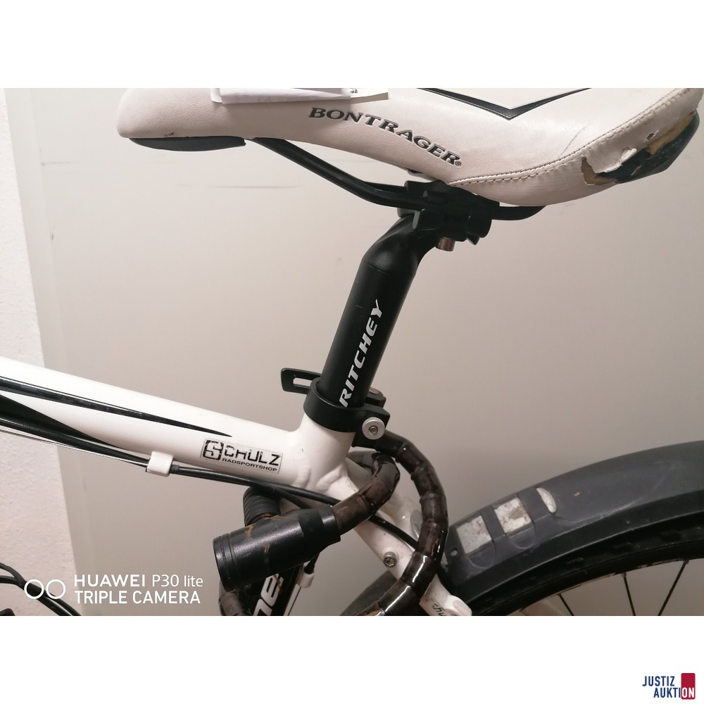 Versteigert wird ein Scrane Mountainbike, weißer Rahmen, in abgebildetem Zustand.