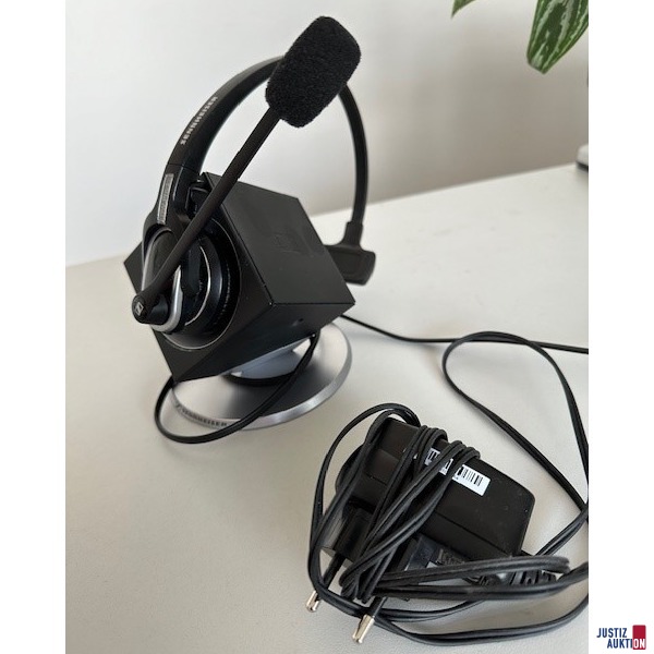 1 x DECT-Headset für PC/Mac und Tischtelefon, Anschluss: mit USB und RJ, Reichweite: bis zu ca. 55 - 180 m, Mikrofon, Akku: bis 12h Laufzeit und 50 % Akku-Aufladung in nur 20 Min., Ohrpolster mit Kunstleder, mit einziehbarem Mikrofonarm, Überkopfbügel, gebraucht, Gebrauchsspuren am Ohrpolster, Bedienungsanleitungen vorhanden, Verpackung nicht mehr vorhanden, funktioniert noch, knarzt manchmal