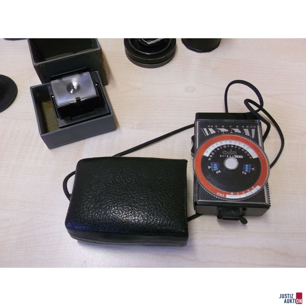 in brauner Original-Ledertasche; - diverse Objektive und Blenden;