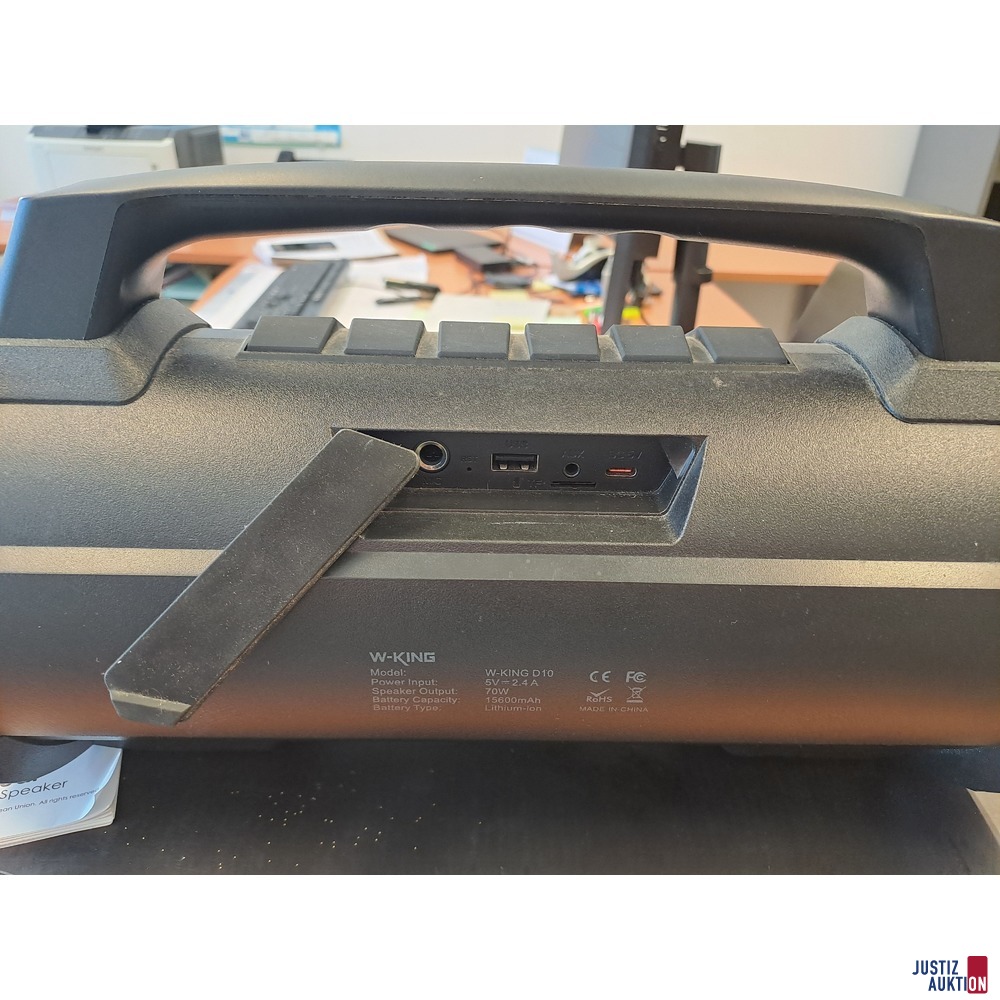 Modell-Nr.: W-King D10; Lautsprecher Ausgangsleistung 70w; Produktgröße: 369mm x 194mm x 154mm/14.53“ x 7.64“ x 6.06“; Frequenzbereich 70Hz-20KHz; Eingang für Musikquelle: Unterstützt Bluetooth/AUX/TF-Karte in