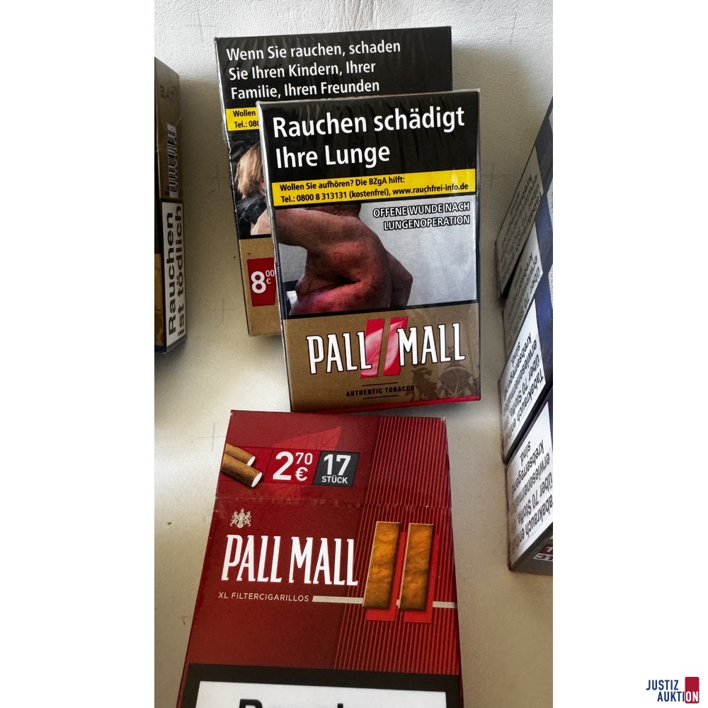 Versteigert werden verschiedene Sorten Zigaretten der Marke PallMall. Einmal 17 Stück, 3 × 20 Stück 4 × 23 Stück 3 × 24 Stück und 4 × 31 Stück. Insgesamt also 15 Schachteln.