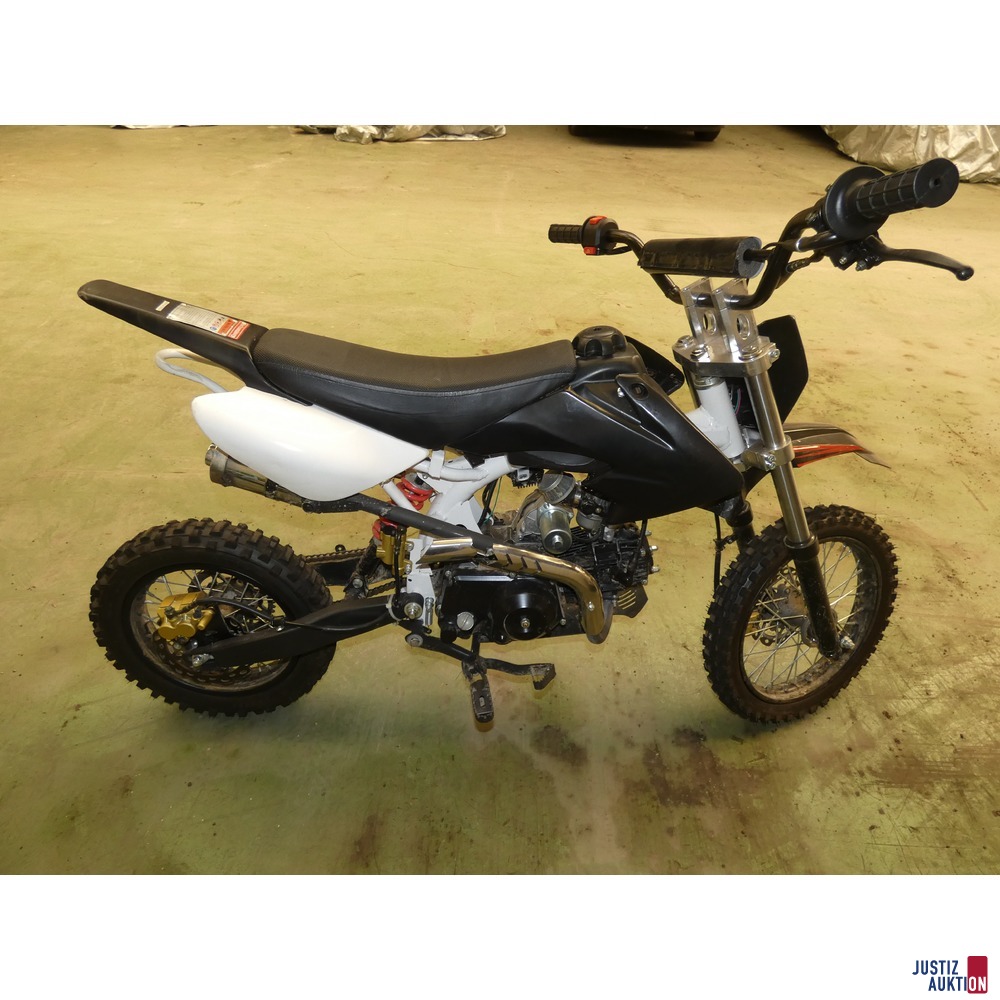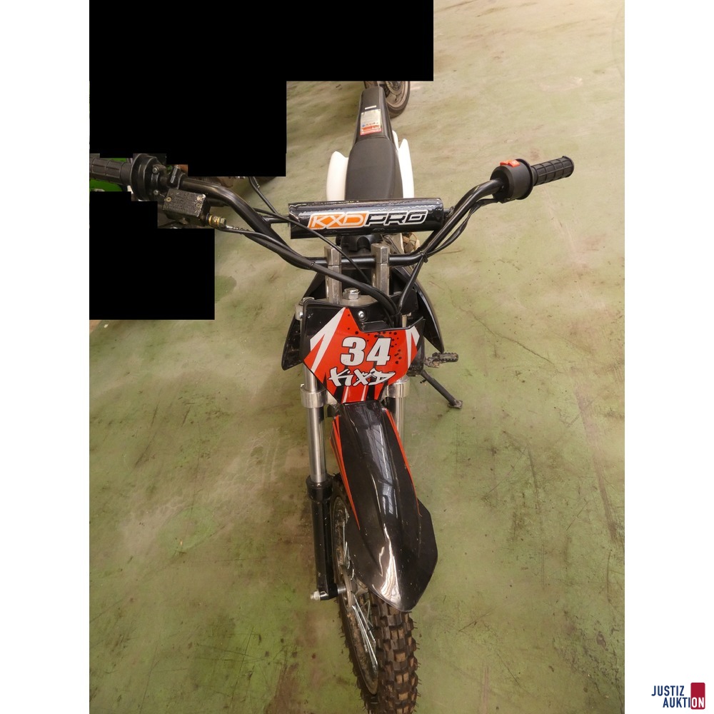 Sie bieten auf ein schwarz-weißes Dirtbike/Pitbike KXD-607. Laut Plakette hat dieses keine Straßenzulassung.